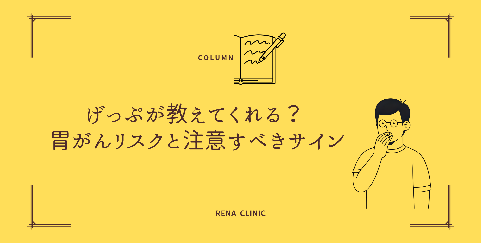 げっぷは、多くの場合無害な生理現象ですが、頻度増加・持続性・他の症状を伴う場合には、胃粘膜の異常や胃がんの初期サインを示すことがあります。ピロリ菌感染、胃炎、胆汁逆流、機能性ディスペプシアなどとの関連も無視できません。早期発見のためには、問診・血液検査・胃内視鏡・バリウム検査などを段階的に検討することが重要です。日常生活では、塩分制限・抗酸化食品の摂取・食事習慣の改善・ストレス管理などが有用です。東京新宿RENA CLINICでは 丁寧な診察・検査体制を備えておりますので、お気軽にご相談ください。